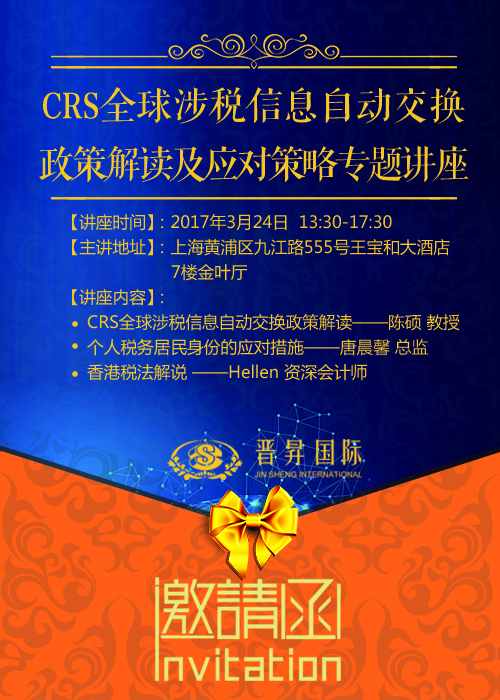 鑒于CRS與我司客戶的利益息息相關,為了讓廣大客戶更深刻地了解CRS,更好地應對CRS可能帶給大家的影響,我司特別安排了一系列CRS專題講座。3月24日,我司將在上海舉辦一場CRS講座(后期還會在深圳、北京等地舉辦,大家可持續(xù)關注我們的微信公眾號了解詳情),并邀請了多位老師為大家全方位解讀CRS,詳細對CRS的熱點政策、實施步驟及各類風險作深度的剖析解讀,并提出合理的解決方案,以幫助大家更好地應對CRS。