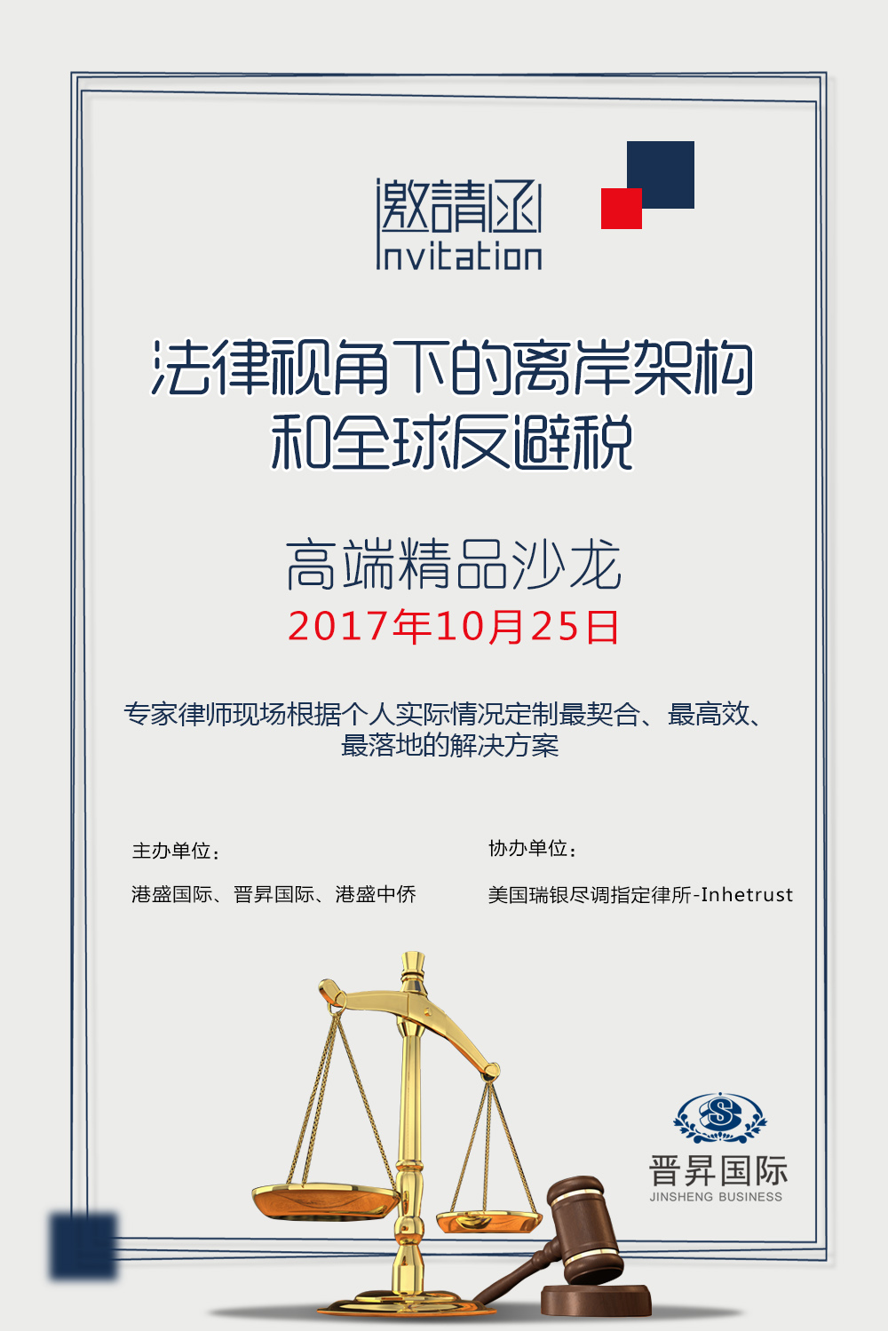 為了讓大家能夠從的法律視角了解全球反避稅趨勢(shì)、離岸架構(gòu)搭建新策略、境外稅務(wù)合理籌劃等內(nèi)容,我司整合實(shí)力雄厚、知名的律所資源,10月25日,將聯(lián)袂國(guó)際財(cái)富規(guī)劃聯(lián)盟(IWP)成員、美國(guó)瑞銀盡調(diào)推薦律所-Inhetrust重磅推出"法律視角下的離岸架構(gòu)和全球反避稅"精品沙龍。