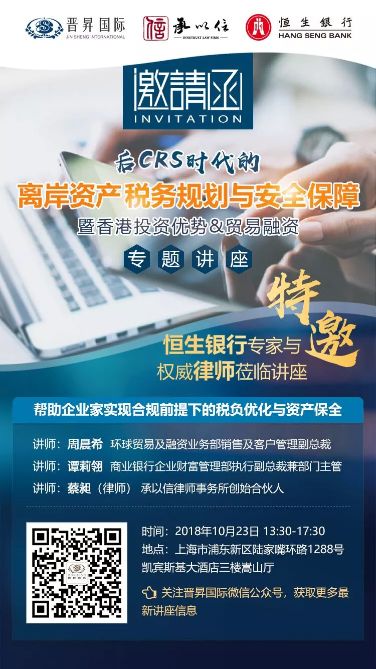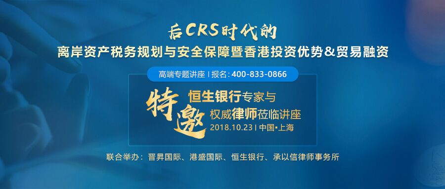 然自今年9月以來,CRS來勢兇猛,內(nèi)地與中國香港就實施稅務事宜自動交換財務帳戶數(shù)據(jù)(自動交換數(shù)據(jù))的安排已生效!海外投資的稅務問題及背后存在的隱患,不容小覷。后CRS時代與稅改新政下,境外離岸資產(chǎn)存在哪些法律問題與稅務風險?如何在合規(guī)前提下實現(xiàn)稅負優(yōu)化與資產(chǎn)保全?10月23日,我們將特邀知名法稅專家與您面對面交流,共同探討離岸資產(chǎn)稅務規(guī)劃與安全保障的新策略!講座名額有限,先到先得,詳見下文。