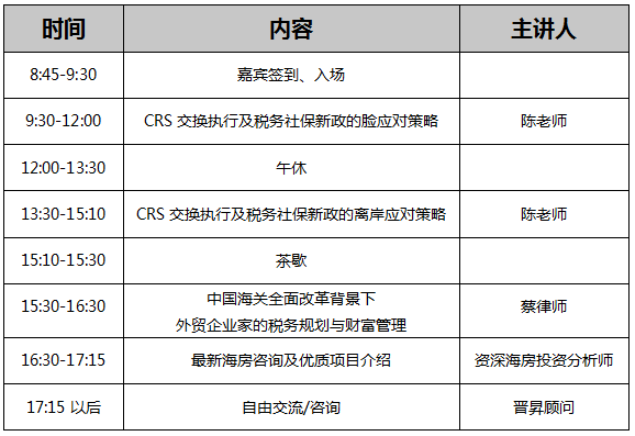 “CRS交換執(zhí)行及稅務(wù)社保新政的離岸應(yīng)對(duì)策略”、“中國(guó)海關(guān)全面改革背景下,外貿(mào)企業(yè)家的稅務(wù)規(guī)劃與財(cái)富管理”、以及備受關(guān)注的海外房產(chǎn)的評(píng)估選擇三大熱點(diǎn)話題,抽絲剝繭解析國(guó)內(nèi)外環(huán)境與新政,助力廣大高凈值及企業(yè)家的財(cái)富管理與企業(yè)發(fā)展之路撥云見日,穩(wěn)健前行!