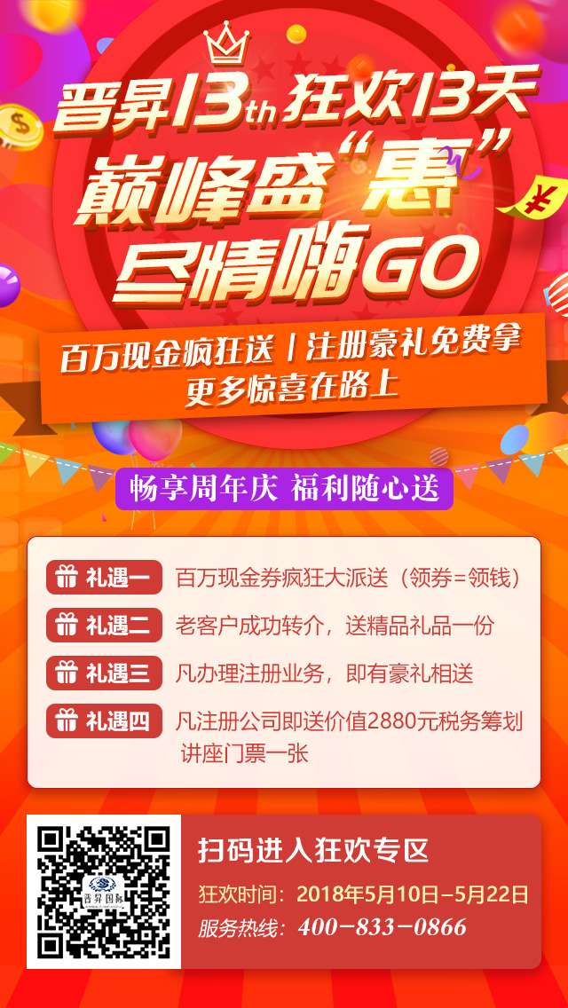 福利到!晉昇十三周年慶典,巔峰盛"惠"第一波福利強(qiáng)勢來襲!"感恩十三年,狂歡十三天"!百萬現(xiàn)金券瘋狂大派送!掃碼領(lǐng)券等于領(lǐng)錢!中國香港、海外公司立減1488元!更有繽紛豪禮隨心送!多重優(yōu)惠同時享!周年慶典感恩回饋!越早下單,優(yōu)惠越大!抓住機(jī)會,盡情嗨GO~~~