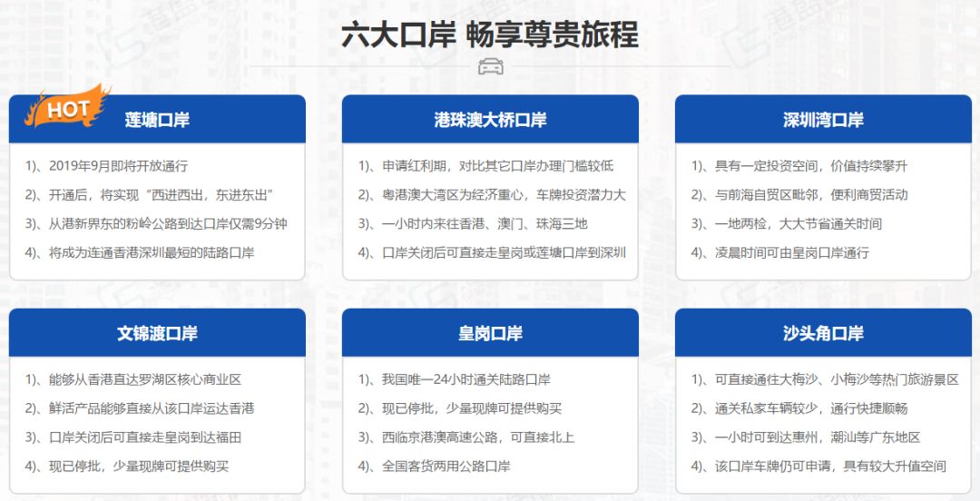 引入相關(guān)城際軌道線路,實施站城一體化開發(fā),皇崗口岸目前正在構(gòu)筑一個跨境樞紐,未來交通只會更為方便,甚至可能成為中國香港連接大灣區(qū)的重要樞紐,隨著皇崗口岸的周邊配套的愈加完善及在深港創(chuàng)新特別合作區(qū)的助推下,不難預測,未來皇崗口岸的粵港車牌價值將重估,對有需要辦理粵港車牌的客戶來說無疑是一個搶先辦理的好時機。